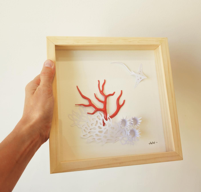 Dans un jeu subtil entre rouge et blanc, cette composition évoque la fragilité du corail et la beauté du monde marin.