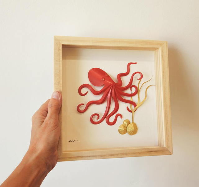 Cette composition met en scène un poulpe en papier rouge au milieu de son récif doré, symbole du monde marin et de son équilibre fragile.